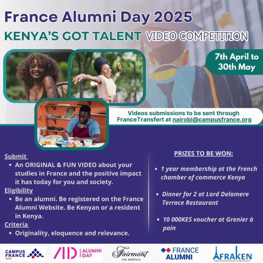 Dans le cadre du France Alumni Day 2025, Campus France Kenya a organisĂ© un concours pour les alumni intitulĂ© "Kenya's got talent". Les alumni devaient rĂ©aliser une vidĂ©o pour prĂ©senter leur sĂ©jour et leurs Ă©tudes en France, et dire en quoi ce voyage a eu un impact positif sur leur vie et leur entourage. ✅